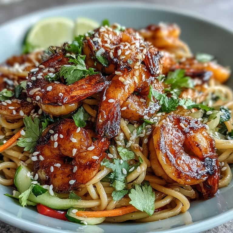 Pin it Tuesday night, I was staring at my pantry wondering how to transform leftover shrimp into something that didn't feel like leftovers at all. Fifteen minutes later, I had this bowl in front of me—noodles glistening with sesame, shrimp charred just right, vegetables practically glowing on top. It became the dish I make when I want restaurant-quality results without the stress, and honestly, it tastes better than what I'd pay for delivery.
