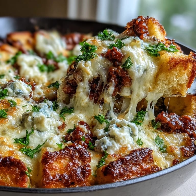 Pin it There's something about cooking in a cast-iron skillet that makes you feel like you're doing something real, something that matters. One Saturday afternoon, I had lasagna on my mind but zero patience for layering noodles, and my bread basket was overflowing with a beautiful Italian loaf. What if I just cubed it, tossed it in garlic butter, and let it become the pasta? The moment those golden bread cubes absorbed all that rich meat sauce and melted cheese, I knew I'd stumbled onto something special—a lasagna that tastes like comfort but behaves like a weeknight miracle.
