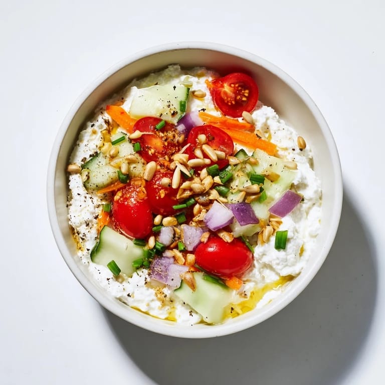 Pin it I discovered this bowl completely by accident one afternoon when I was hunting through my fridge for something quick. There was cottage cheese sitting there looking lonely, and instead of reaching for the usual suspects, I started grabbing whatever vegetables caught my eye—cherry tomatoes, cucumber, a carrot I'd been meaning to use. The sunflower seeds were almost an afterthought, but something about the combination just clicked. Now it's become my go-to when I need fuel without the fuss.