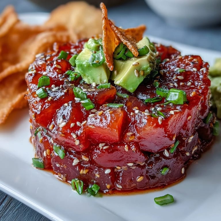 Pin it My neighbor showed up with a container of sushi-grade tuna one Saturday, insisting I needed to stop overthinking appetizers and just make something bold. Twenty minutes later, I'd thrown together this spicy tartare, and the way it disappeared from the plate told me everything—sometimes the best dishes come from happy accidents and a little kitchen courage.