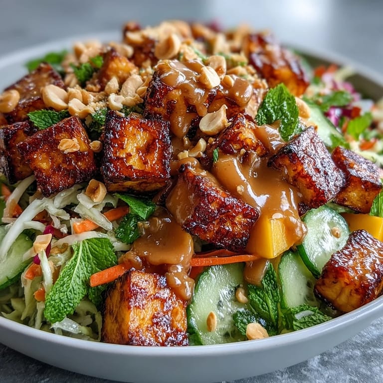 Pin it The sharp sweetness of mango always reminds me of summer evenings when the kitchen window is cracked open and a chorus of street sounds leaks in. The inspiration for this salad came from a spontaneous craving for something cold and crunchy—right in the middle of a muggy afternoon. I remember rummaging through the fridge and finding a lone ripe mango, a bunch of herbs, and just enough tofu left for a proper adventure. There is something about the combination of fresh, crisp vegetables and creamy peanut dressing that invites you to play with texture and flavor. The first crackle of frying tofu in the pan was oddly satisfying, like the gentle punctuation at the end of a long week.
